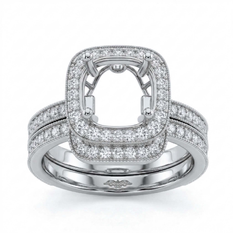 Intricately designed, this milgrain round cut semi mount engagement ring and wedding band features 1ct. round halo pave set diamonds along the shank. Made in 14K white gold, this bridal set is truly beautiful.