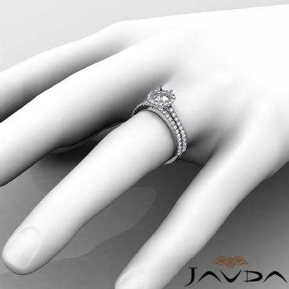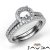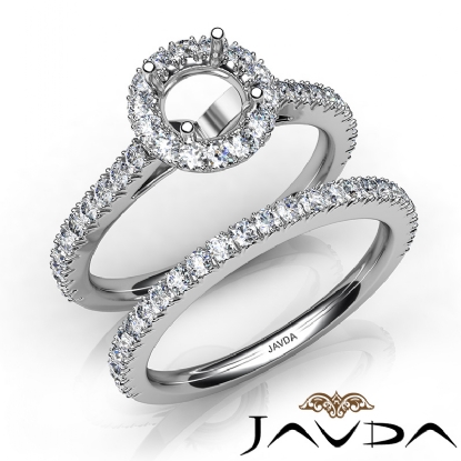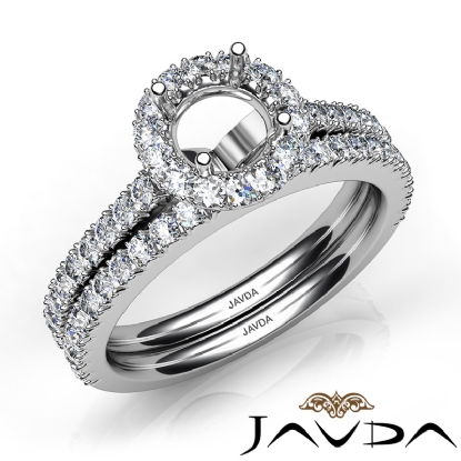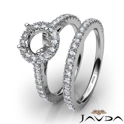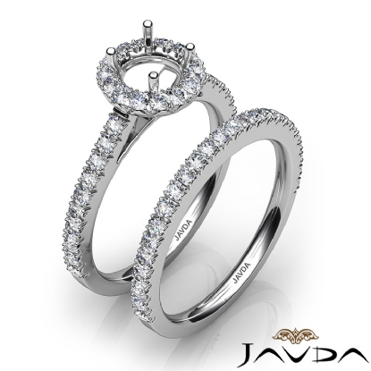 Gorgeous with a touch of vintage, this 14K white gold semi mount round engagement ring and matching band, features french cut pave round set diamonds. This bridal set weighs 1.5 carat.