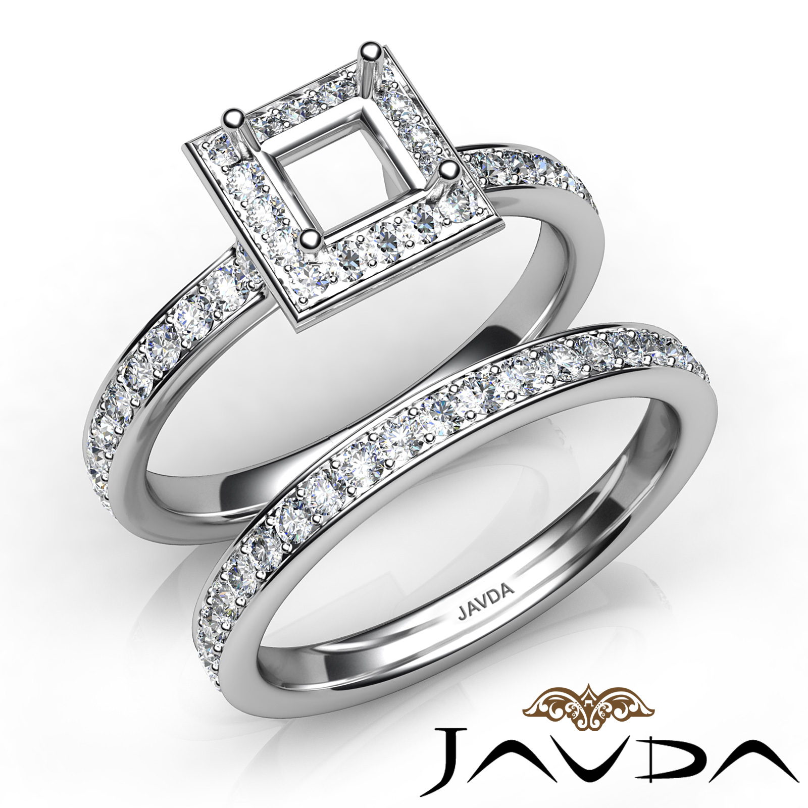 Capture your lasting love with this 0.95 carat Princess Cut semi mount engagement ring and matching band that features round diamonds in halo along the shank. This bridal set is made in 14K white gold.