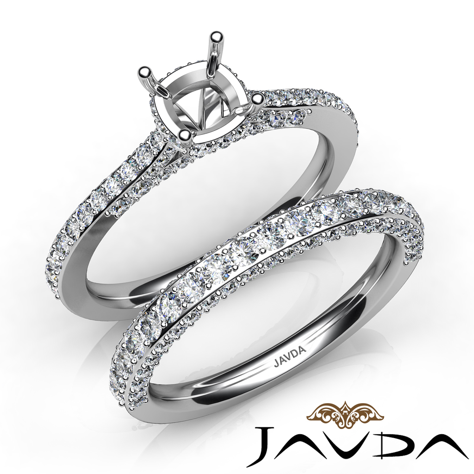 Elegant in any way, this cushion cut diamond engagement semi mount bridal set ring made in 14k white gold. Feature 1.65ct. round pave set diamonds along the shank and matching wedding band. Also available in 14k & 18k white gold, yellow gold, rose gold and platinum 950.