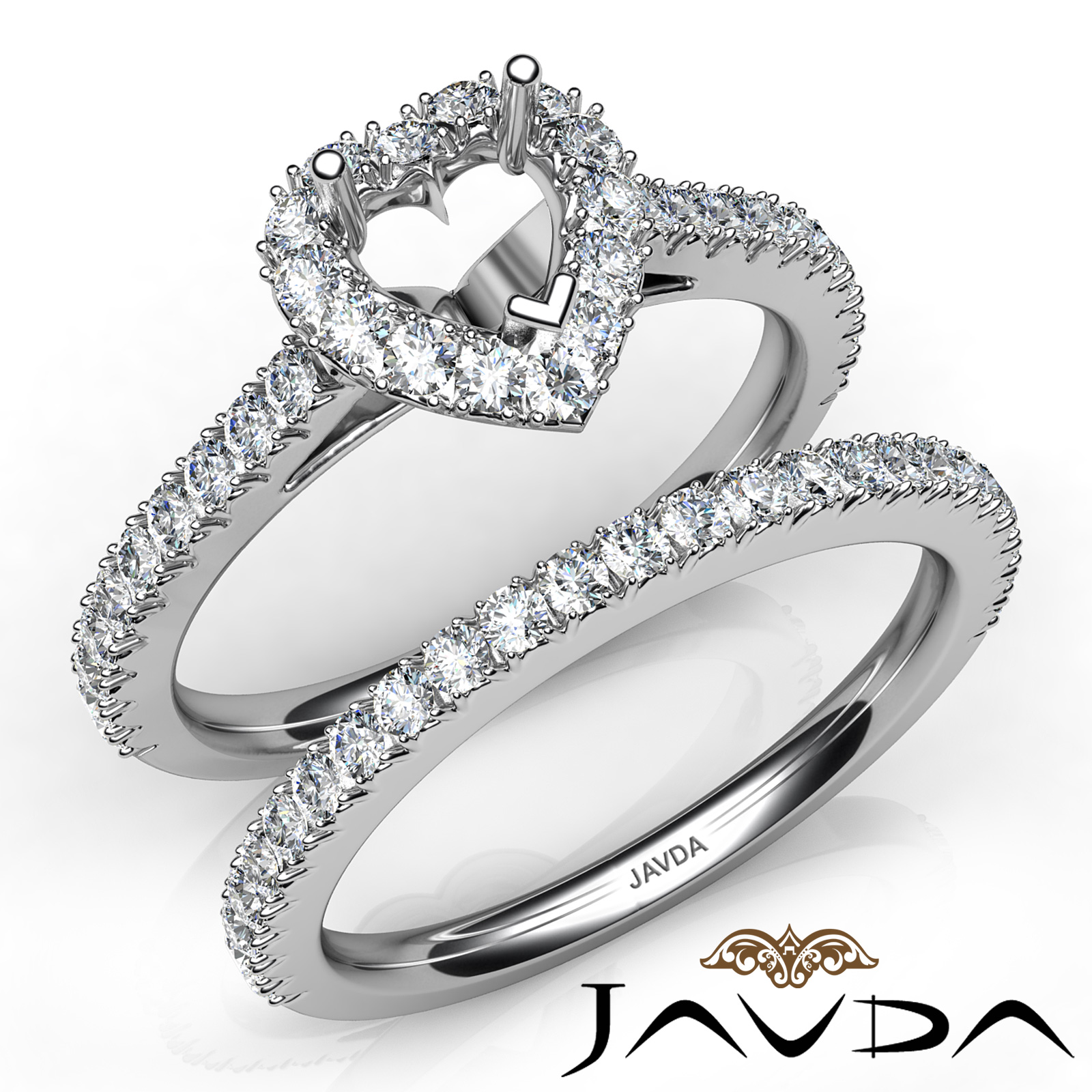 Gorgeous with a touch of vintage, this 14K white gold semi mount heart engagement ring and matching band, features french cut pave round set diamonds. This bridal set weighs 1.5 carat.
