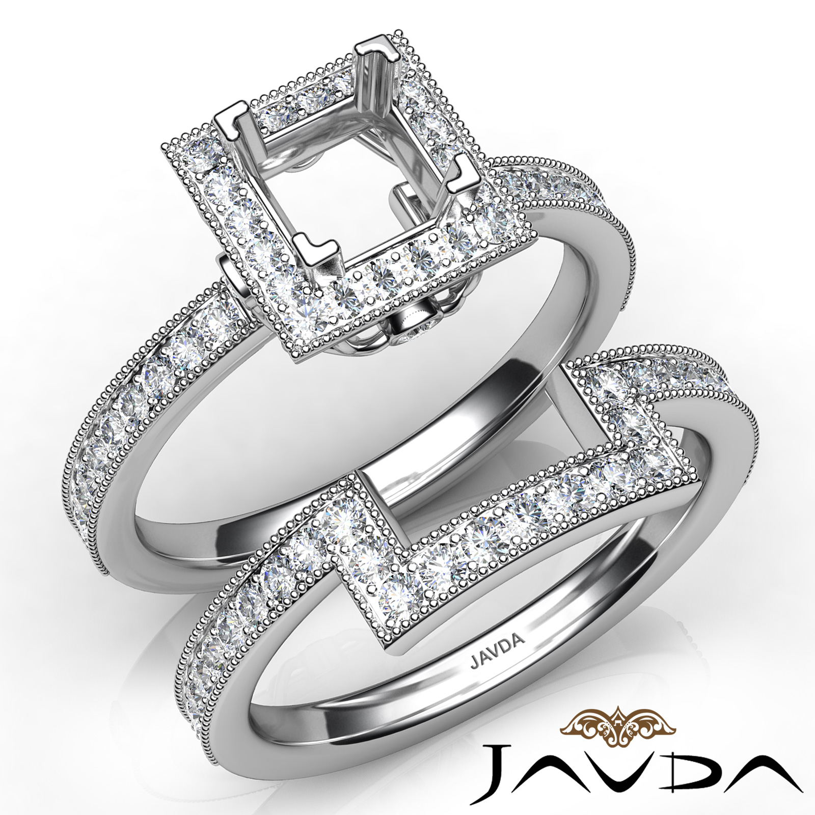 Intricately designed, this milgrain princess semi mount engagement ring and wedding band features 1ct. round halo pave set diamonds along the shank. Made in 14K white gold, this bridal set is truly beautiful.