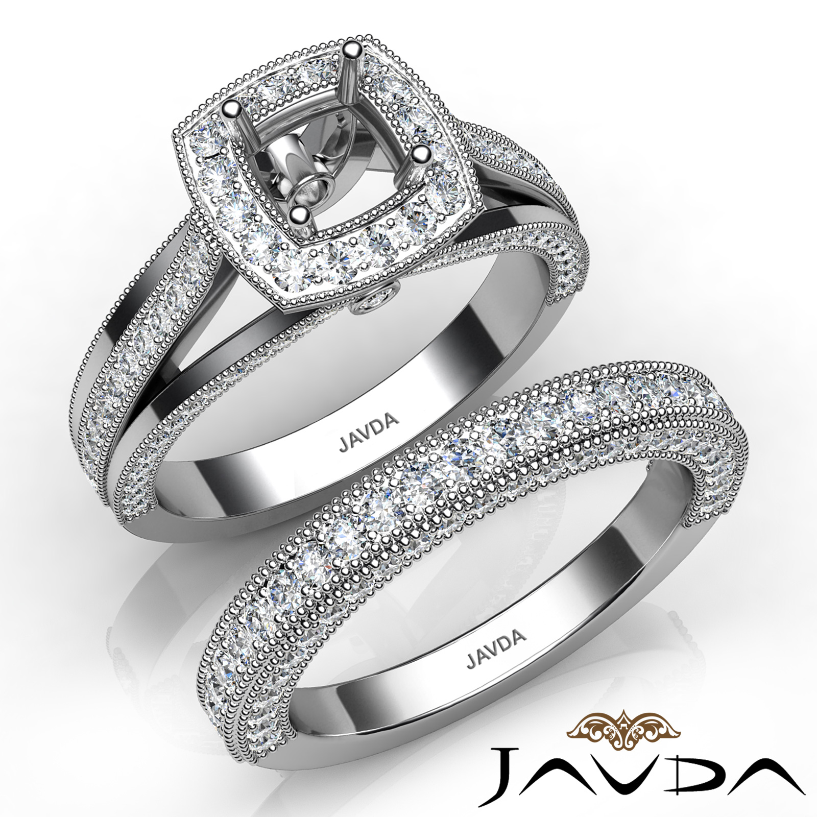 Pave Diamond Engagement Ring Cushion Semi Mount Bridal Sets 14K W Gold 1.70Ct.