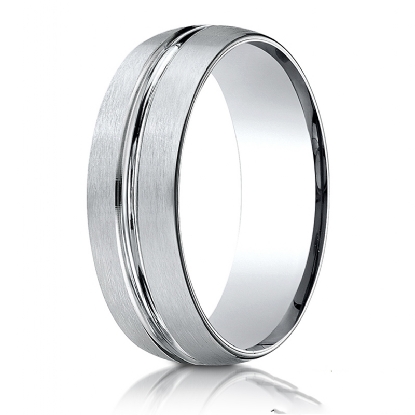 An elegant 7mm comfort fit satin finished carved center groove design wedding band. Made from high polished 14k white gold for both men and women. Available in white gold, yellow gold and rose gold.