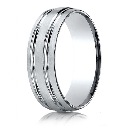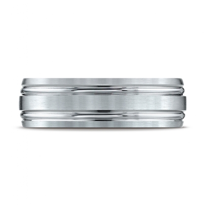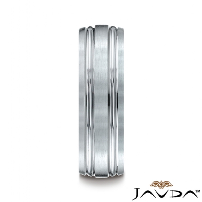 This 7mm comfort fit satin finished with two parallel grooves carved design wedding band made from high polished 14k white gold. Available in white gold, yellow gold and rose gold.