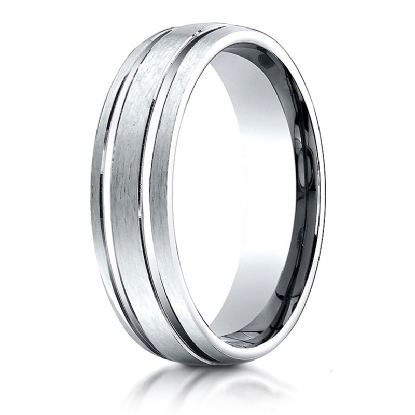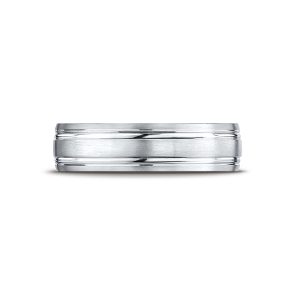This 6mm comfort fit satin finished carved design men's wedding band made from high polished 14k white gold. This ring features two parallel cuts along the center of the ring for a continuous pattern of style. Available in white gold, yellow gold and rose gold.