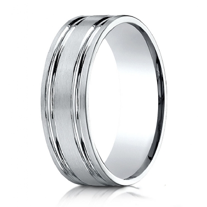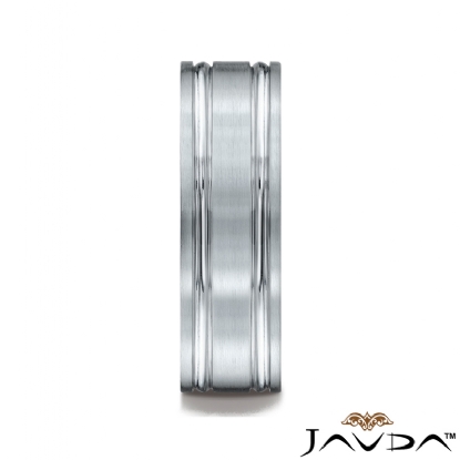 This 7mm comfort fit satin finished carved design band for men's and women's features two high polished parallel grooves and stripes along the center. The quality comfort fit 14k white gold wedding band is long lasting and perfect for everyday wear. Available in white gold, yellow gold and rose gold.