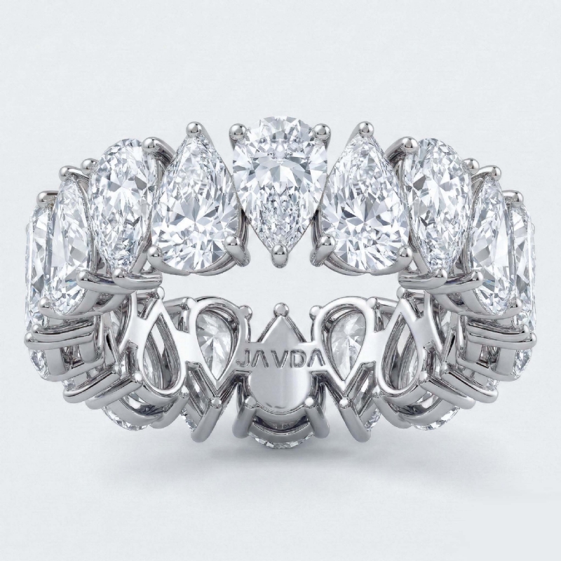 A pulsating row of alternating pear-shaped HPHT lab-grown diamonds handmade in 14k white gold, this will look fabulous on any outfit. Showcases 6.39 carat pear diamond women's eternity wedding band beautifully secured with shared prong, also available in 14k & 18k white gold, yellow gold, rose gold and platinum 950. If you don't find your desired jewelry, please don't hesitate to contact our designer to make your custom jewelry design.