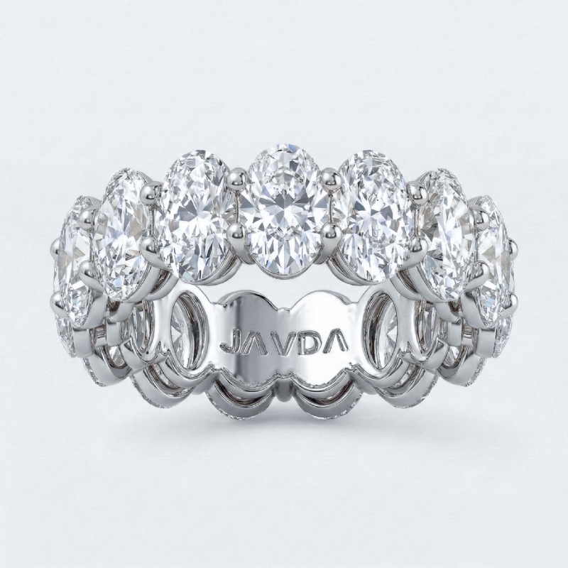 Celebrates the power of love with breathtaking brilliance 7.49 carat of oval HPHT lab-grown diamonds. This elegant oval diamond eternity wedding band graces the finger with beautiful diamonds set in sculpted shared-prongs handmade in 14k white gold, also available in 14k & 18k white gold, yellow gold, rose gold and platinum 950. If you don't find your desired jewelry, please don't hesitate to contact our designer to make your custom jewelry design