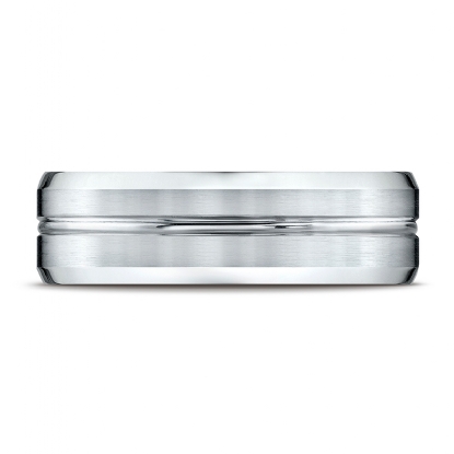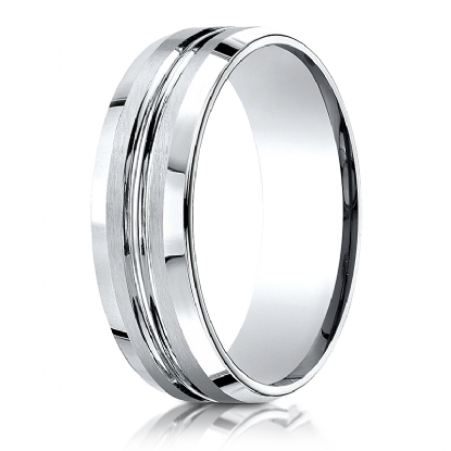 Handsome comfort fit carved design center grooved wedding band features satin finished and high polish beveled edges with center trim. This sleek and fashionable 7mm men's wedding band is comfortable and durable, this band is made from quality 14k white gold. Available in white gold, yellow gold and rose gold.