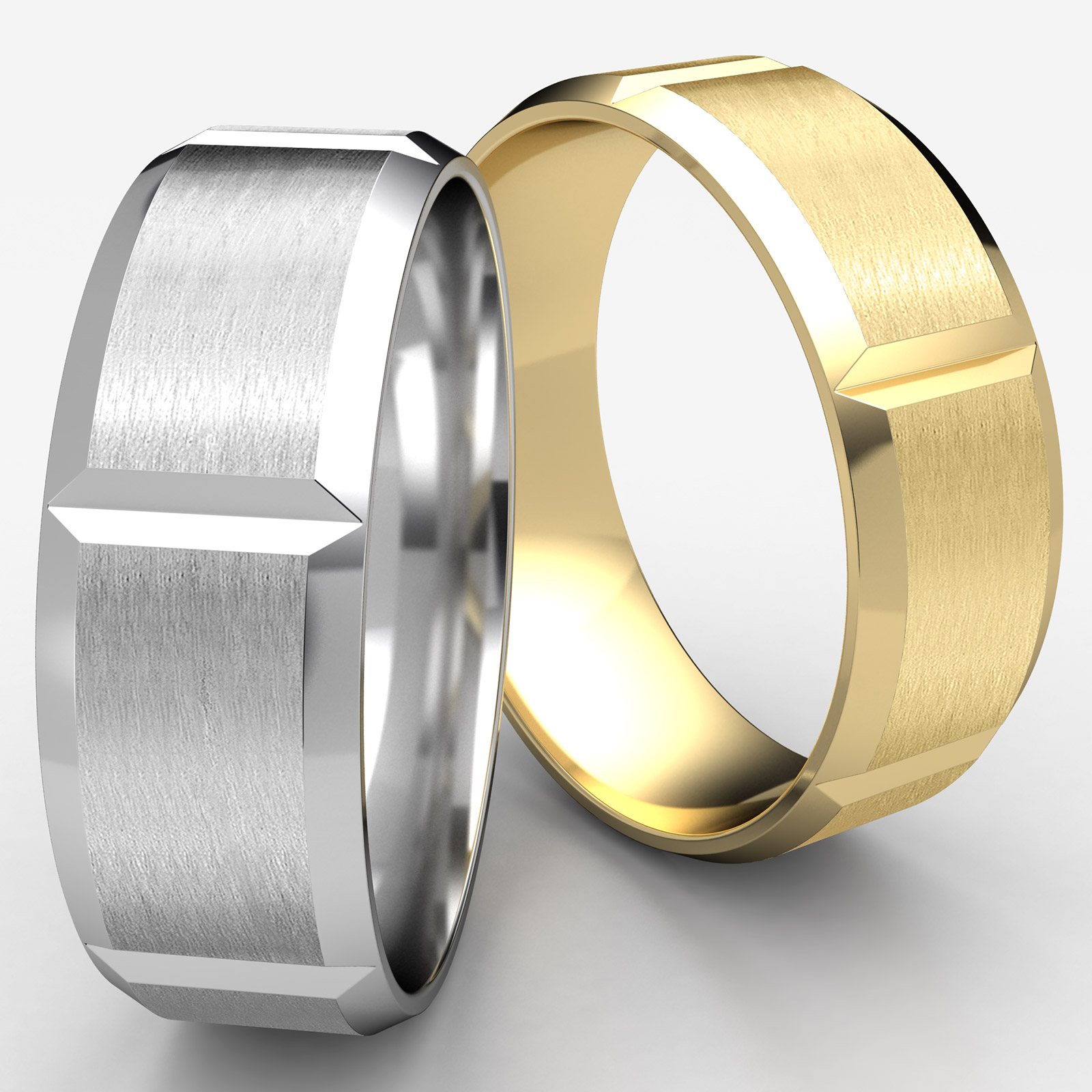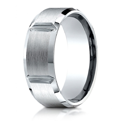 This unisex 8mm comfort fit verticle grooved carved design wedding band features satin finished and high polish beveled edges. This sleek and fashionable wedding band is comfortable to wear for men's and women's, this band is made from quality 14k white gold. Available in white gold, yellow gold and rose gold.