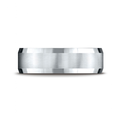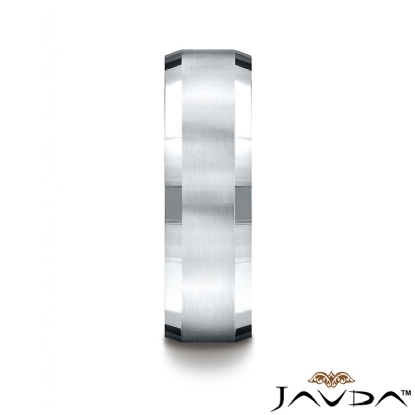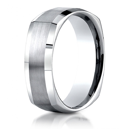 This incredible 7mm comfort fit four sided men's wedding band features a satin finished center and a high polished beveled edge. This squared style brushed wedding band is comfortable to wear everyday and quality craftsmanship makes long lasting, this band is made from 14k white gold. Available in white gold, yellow gold and rose gold.