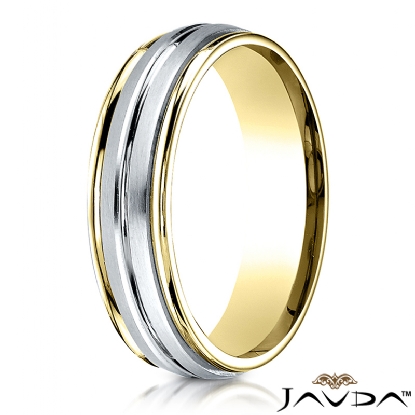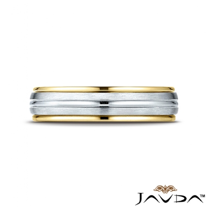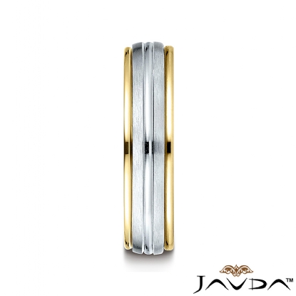 This unisex comfort fit satin finished carved design wedding band features a high polished round edge and center grooved. Glorious wedding band is comfortable to wear for both men's & women's. Made from 14k two tone gold and measures 6mm wide. This classic wedding band is a symbol of your everlasting commitment.
