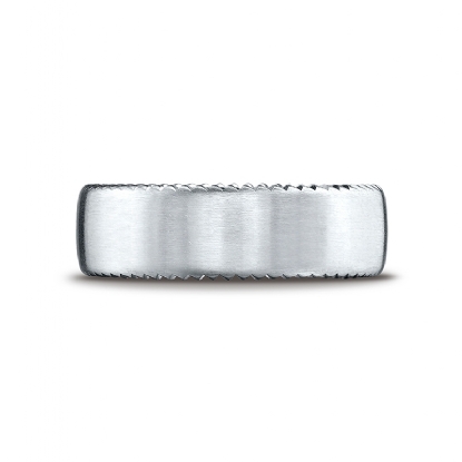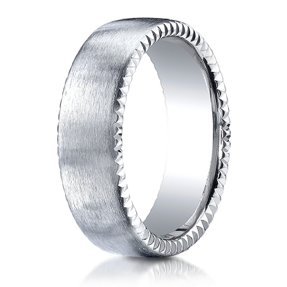This unique 7.5mm comfort fit satin finished carved design wedding band features an elegant rivet coin edging for unforgettable style. The quality comfort fit 14k white gold men's wedding band is long lasting and perfect for everyday wear. Available in white gold, yellow gold and rose gold.