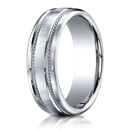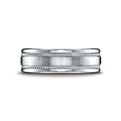 This 7.5mm classic comfort fit satin finished wedding band accented with two off-center rope details and rounded edges. The quality comfort fit 14k white gold men's wedding band is long lasting and perfect for everyday wear. Available in white gold, yellow gold and rose gold.