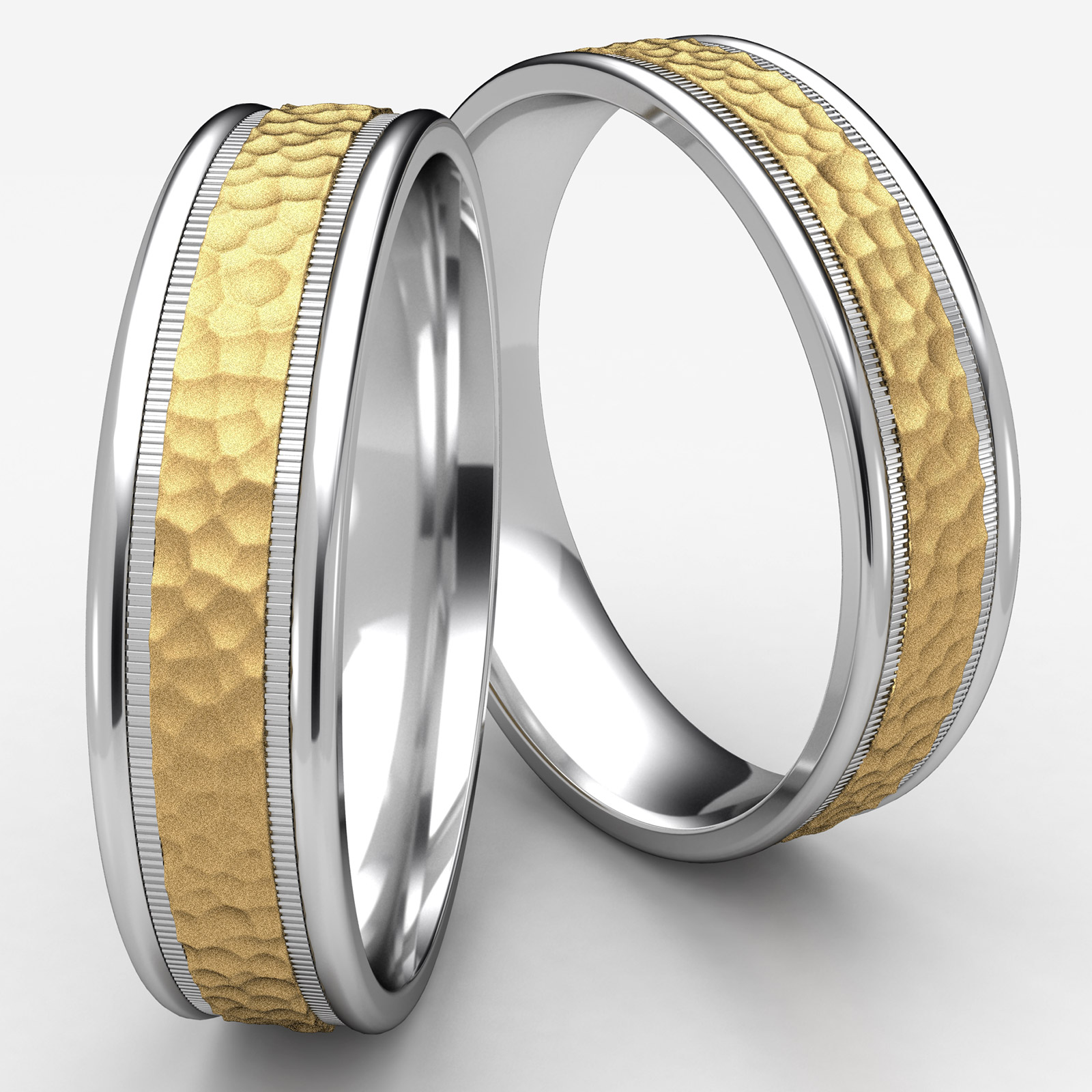 Unisex Two Tone Gold Hammered Center Milgrain Wedding Band