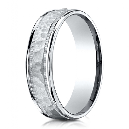 This stunning comfort fit carved design unisex wedding band features hammered finished center with milgrain accents along the high polished edges for a stylish look. The quality comfort fit gold wedding band for men's and women's is long lasting and perfect for everyday wear. This incredible band is made from 14k white gold, measures 6mm wide. Available in white gold, yellow gold and rose gold.
