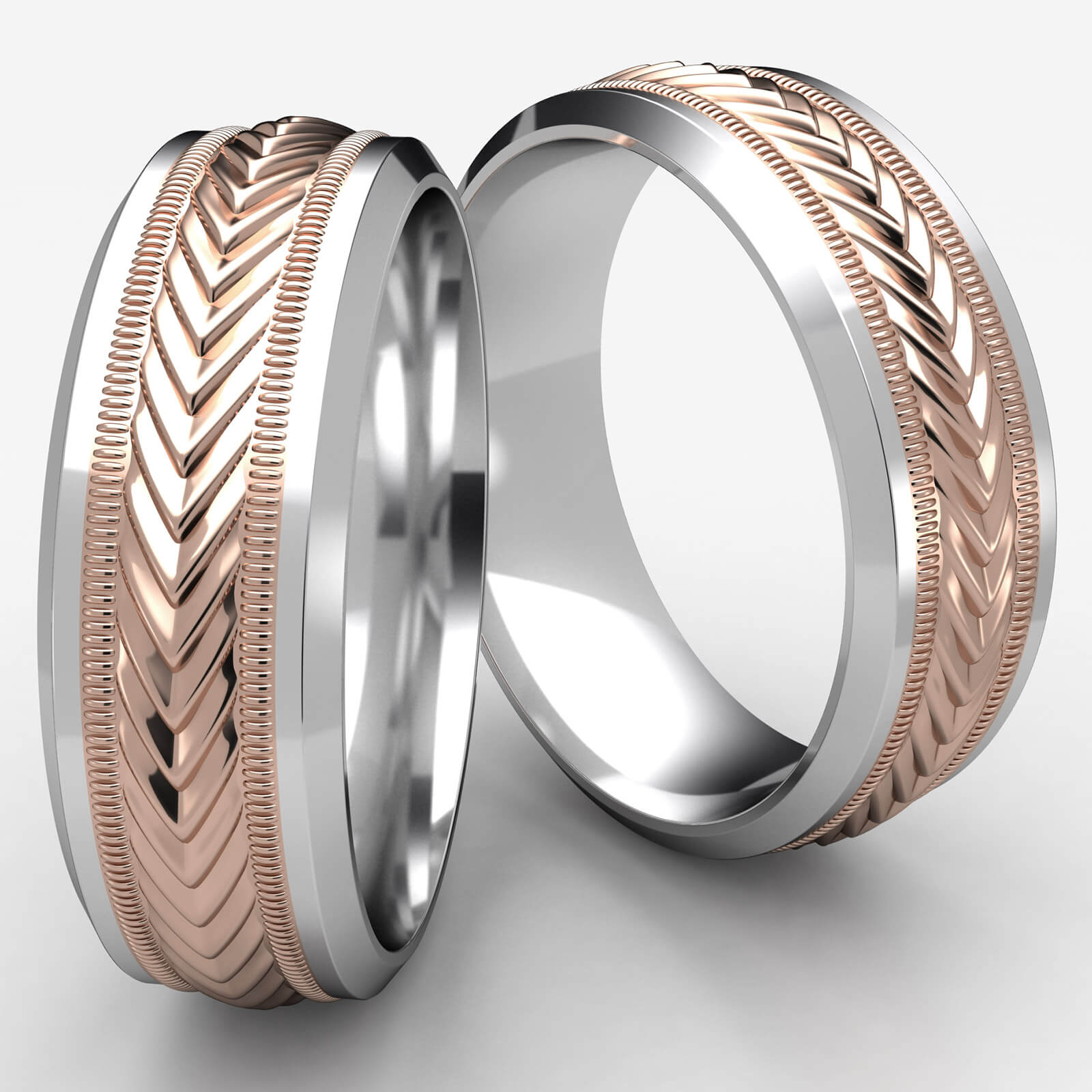 This comfort fit 8mm carved unisex wedding band features harvest design center with milgrain accents with high polished drop beveled edges. The sharp angular cuts in rose gold creating arrow pattern along the center, create a stunning effect as this multi-gold design band reflects light. This incredible band is made from quality 14k two tone gold.