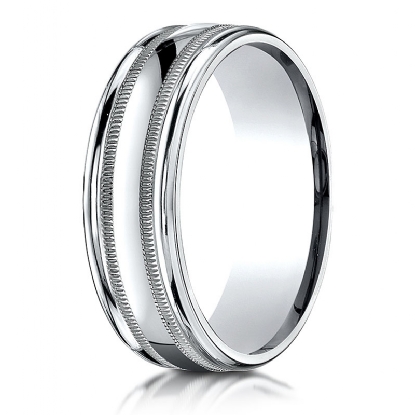 This 7mm comfort fit unisex carved design wedding band features a low domed high polished center with milgrain and polished round edge. The high quality gold wedding band for men's and women's is durable and comfortable to wear everyday. This gorgeous band is made from 14k white gold. Available in white gold, yellow gold and rose gold.