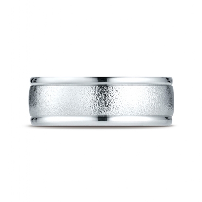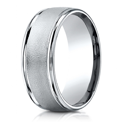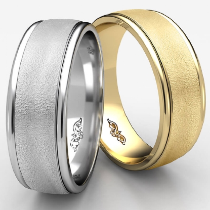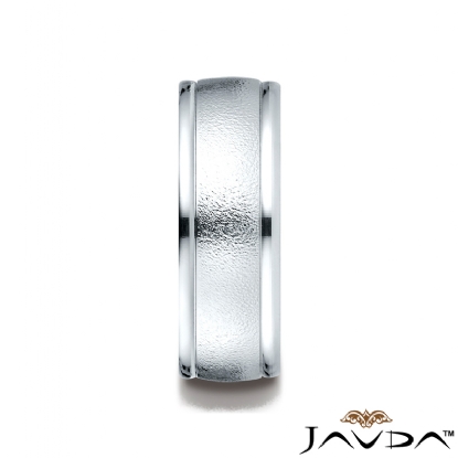 This 8mm handsome comfort fit men's wedding band features a wire brushed finished along the center and a high polished round edges. The stunning ring is made from 14k white gold and it is comfortable to wear everyday. This stylish and classic quality gold wedding ring is long lasting. Available in white gold, yellow gold and rose gold.