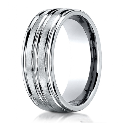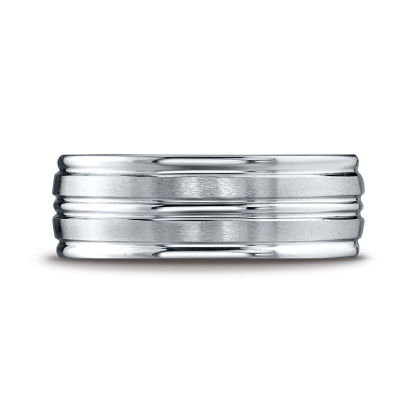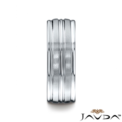 This comfort fit 8mm unisex satin finished carved design wedding band features a center groove and high polished round edges. The bold width gold wedding band for men's and women's symbolizes everlasting love. This incredible band is made from quality 14k white gold. Available in white gold, yellow gold and rose gold.