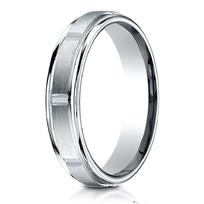 An elegant 4mm unisex comfort fit carved design wedding band features a satin finished verticle center cuts with high polished round edges. The stylish and classic gold wedding ring for men's and women's is comfortable to wear everyday. This incredible band is made from quality 14k white gold. Available in white gold, yellow gold and rose gold.