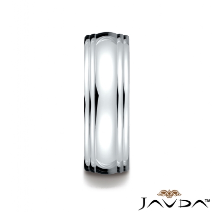 A shining comfort fit high polished carved design wedding band features a high polished finish double round edge. This classic domed handsome look wedding band is made from 14k white gold, measures 7.5mm wide. This fashionable men's wedding band is durable and comfortable to wear everyday. Available in white gold, yellow gold and rose gold.