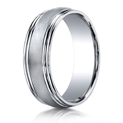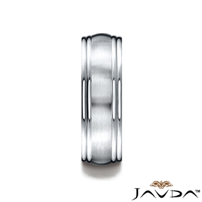 Unique comfort fit carved design wedding band features a satin finished center and high polished double round edge. This classic domed handsome look wedding band is made from 14k white gold, measures 7.5mm wide. This fashionable men's wedding band is long lasting and comfortable to wear everyday. Available in white gold, yellow gold and rose gold.