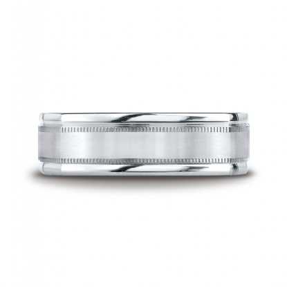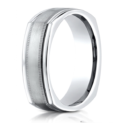 This incredible 7mm comfort fit four sided men's wedding band features a satin finished along the center with milgrain and rounded edges. This squared style carved design wedding band is comfortable to wear everyday and quality craftsmanship makes long lasting, this band is made from 14k white gold. Available in white gold, yellow gold and rose gold.