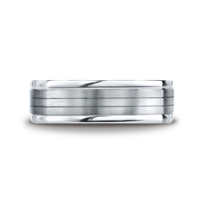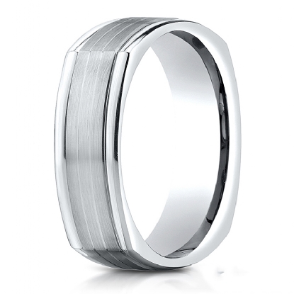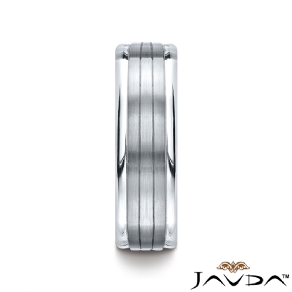 This timeless 7mm comfort fit four sided wedding band features a satin finished parallel center cuts with polished rounded edges for noticeable style. Unique squared style carved design men's wedding band is comfortable to wear everyday and quality craftsmanship makes long lasting. This band is made from 14k white gold. Available in white gold, yellow gold and rose gold.