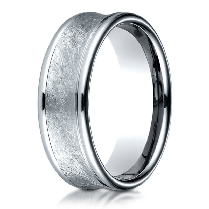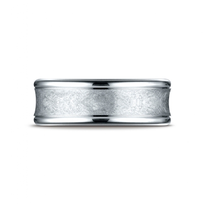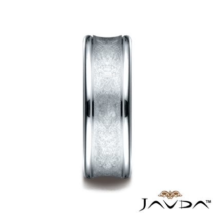 This glorious comfort fit 7.5mm carved wedding band features concave design with center swirled finished and high polished round edge. This stylish unisex wedding band is made from quality 14k white gold. The high polished round edge completes this stunning piece. Available in white gold, yellow gold and rose gold.