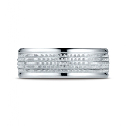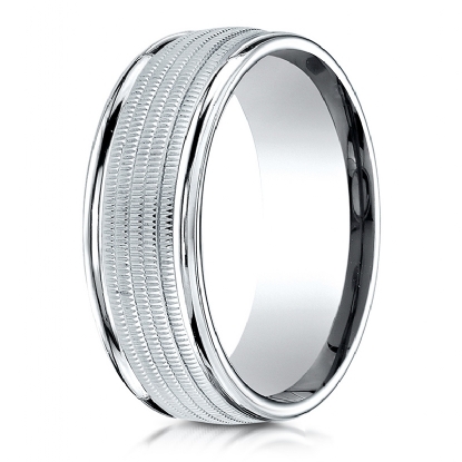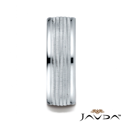 This stylish 8mm comfort fit carved design unisex wedding band features a milgrain center with high polished round edges. This stunning solid wedding band for men's and women's is comfortable to wear everyday and quality craftsmanship makes this long lasting band a great value. Made from 14k white gold. Available in white gold, yellow gold and rose gold.