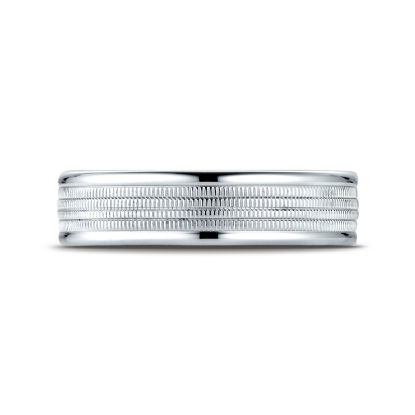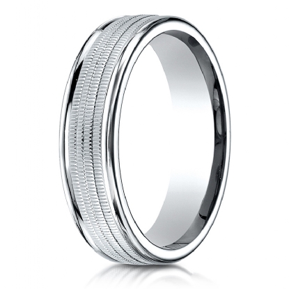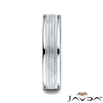 An elegant comfort fit carved design unisex wedding band features a milgrain center with high polished round edges. This stunning solid wedding band for men's and women's is long lasting and perfect for everyday wear. Made from 14k white gold, measures 6mm wide. Available in white gold, yellow gold and rose gold.