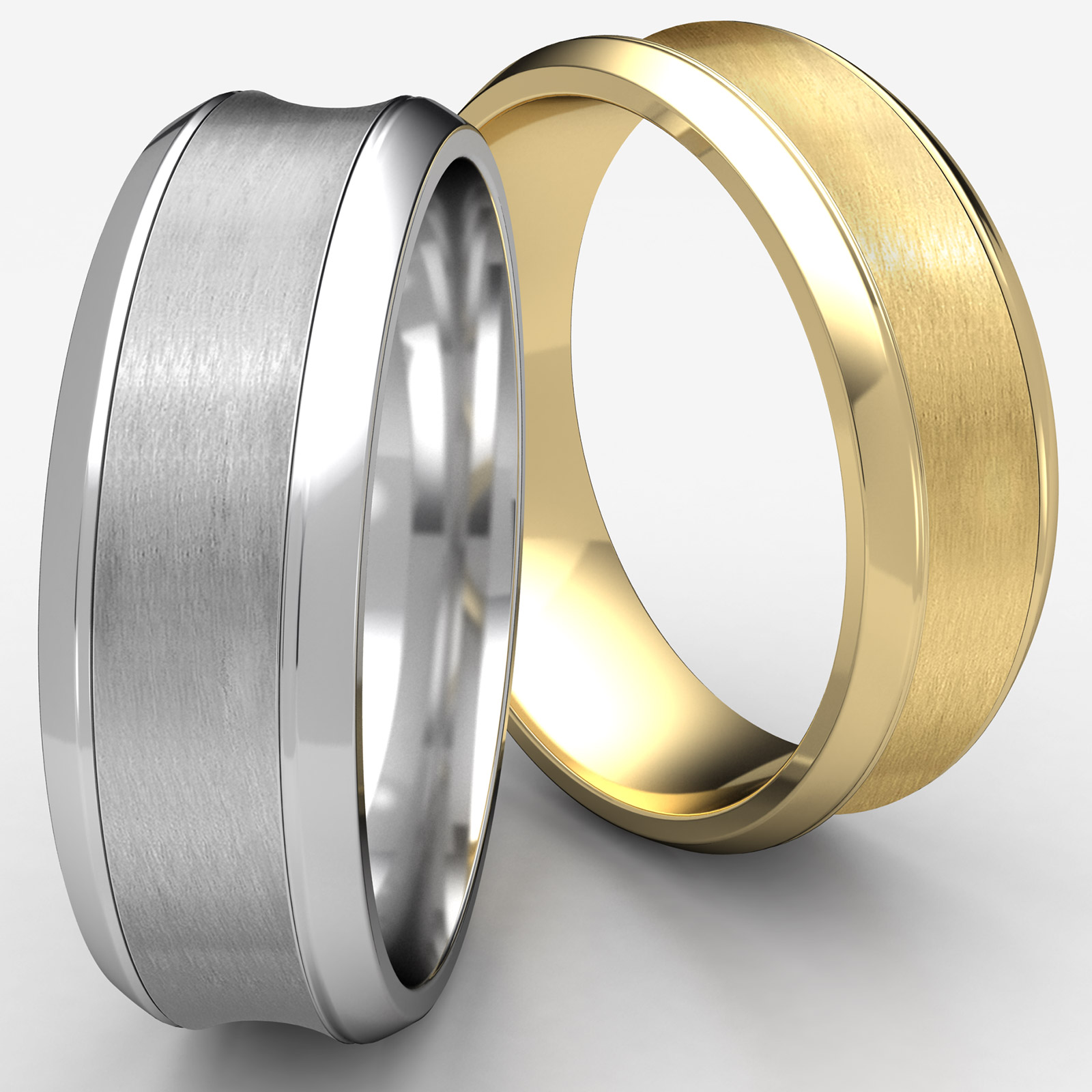 This classic and stylish comfort fit satin finished unisex wedding band features a concave center and beveled edges. This charming and modern wedding band for men's and women's is long lasting and perfect for everyday wear. Made from 14k white gold, measures 7.5mm wide. Available in white gold, yellow gold and rose gold.
