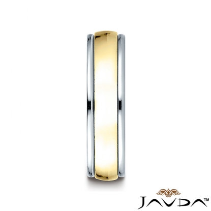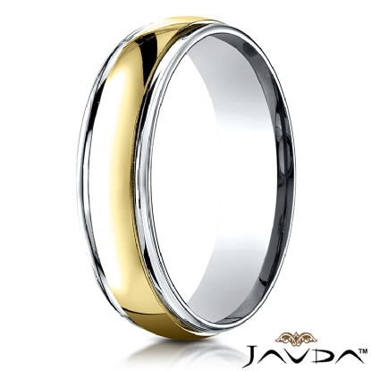 This classic comfort fit unisex carved wedding band features a high polished yellow gold along the center with white gold round edges. The perfect modern and classy combination of wedding band for men's and women's is comfortable to wear everyday. Made from 14k two tone gold, measures 6mm wide.