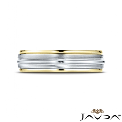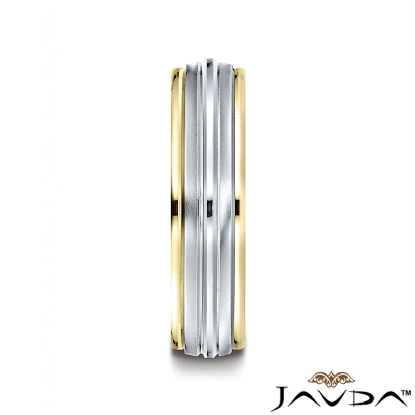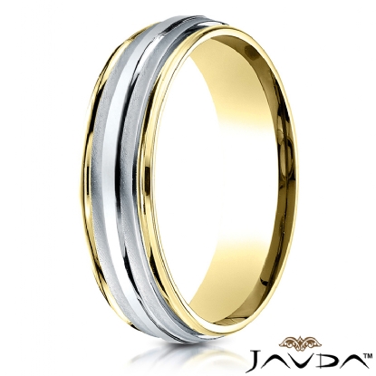 This attractive comfort fit unisex pledge design wedding band features a high polished yellow gold round edges and white gold center satin finished along the grooves for modern yet classic look. A charming wedding band for men's and women's is comfortable to wear everyday. Made from 14k two tone gold, measures 6mm wide.
