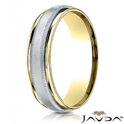 This incredible comfort fit unisex carved wedding band features a white gold satin finished center along with milgrain detailing and yellow gold high polished round edges completes the look. Expertly crafted this modern ring for men's and women's is comfortable to wear everyday. Made from 14k two tone gold, measures 6mm wide.