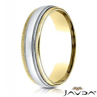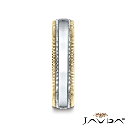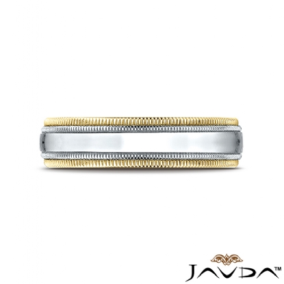 This delicate comfort fit unisex carved wedding band features a high polished finished double milgrain edges in yellow gold and white gold in center. Expertly crafted this modern ring for men's and women's is comfortable to wear everyday. Made from 14k two tone gold, measures 6mm wide.