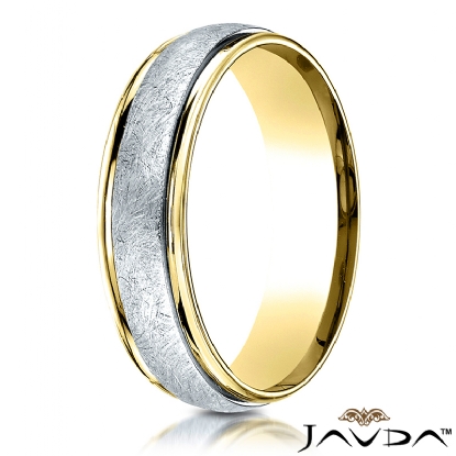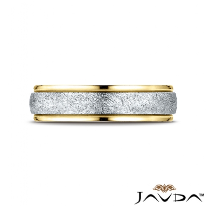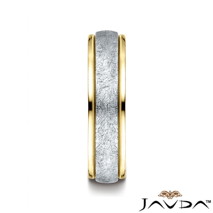 This modern comfort fit handsome carved wedding band features a swirl finish design center along the high polished yellow gold round edges. This delightful wedding ring for men's is comfortable to wear everyday. Crafted in 14k two tone gold, measures 6mm wide.