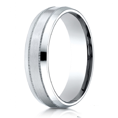 This comfort fit unisex carved wedding band features a satin finished center and milgrain along with beveled edges. The gorgeous wedding ring for men's and women's is long lasting and perfect for everyday wear. Made from 14k white gold, measures 6mm wide. Available in white gold, yellow gold and rose gold.