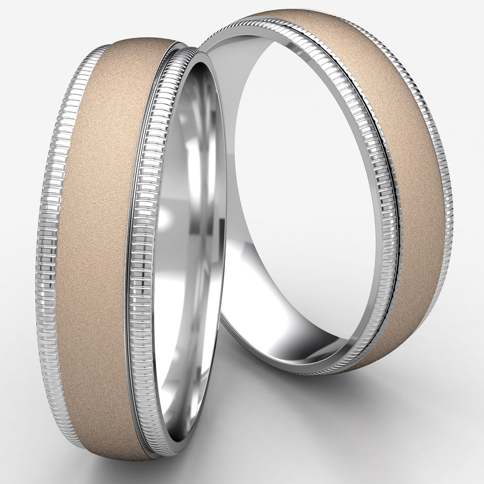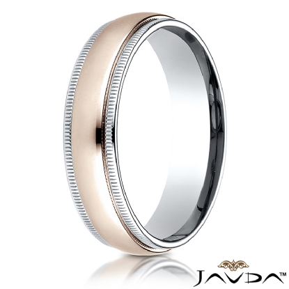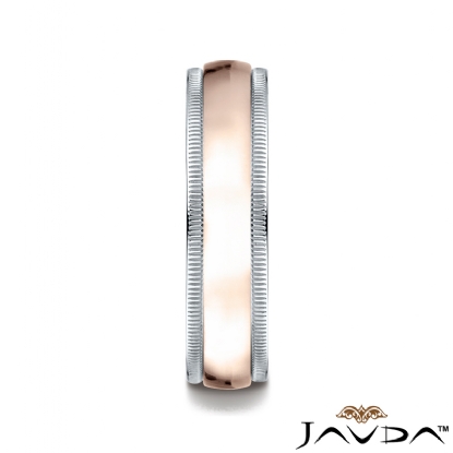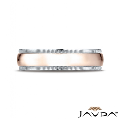 An elegant comfort fit unisex carved design wedding band features a low dome high polished 14k rose gold along the center with milgrain edges. The milgrain detailing completes this look by expert artisan, made from 14k two tone gold, measures 6mm wide. This ring for men's and women's is long lasting and perfect for everyday wear.