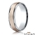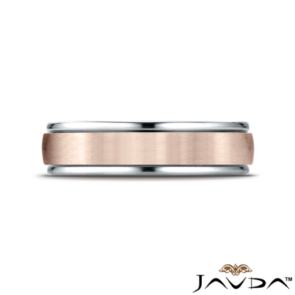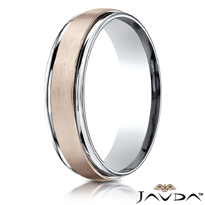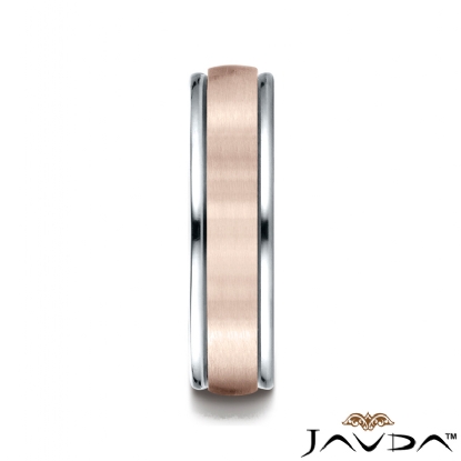 This unisex comfort fit carved design wedding band features a satin finished 14k rose gold along the center with high polished edges for noticeable style. Made from 14k two tone gold, measures 6mm wide. This ring for men's and women's is long lasting and perfect for everyday wear.