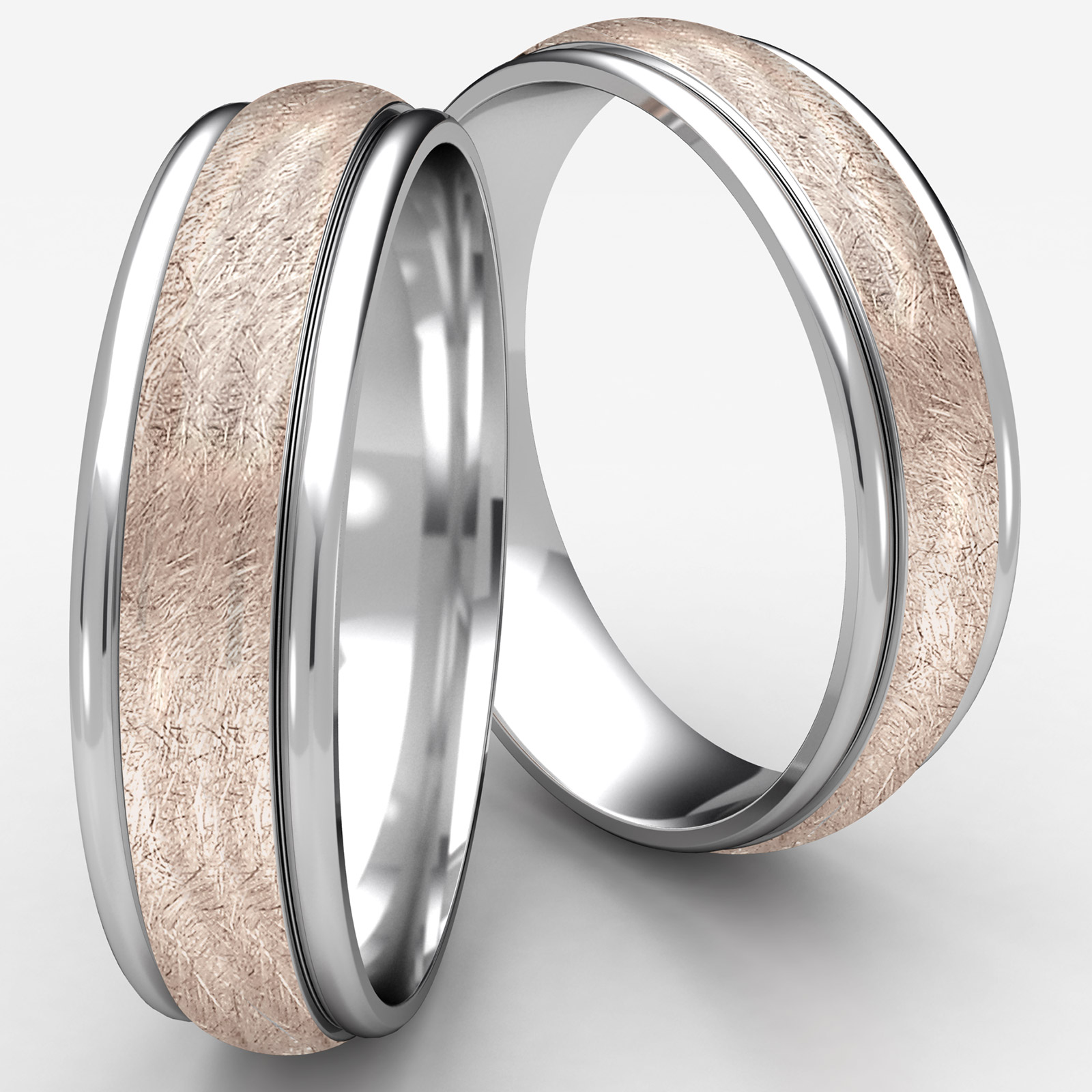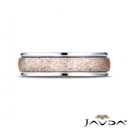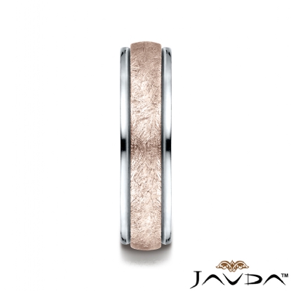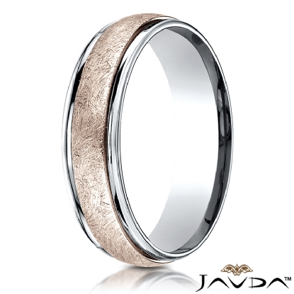 This incredible comfort fit carved design men's wedding band features a high polished white gold round edges with swirl finished rose gold along the center for noticeable style. The perfect combination creates an unique style, made from 14k two tone gold, measures 6mm wide. This handsome ring is long lasting and comfortable to wear everyday.
