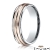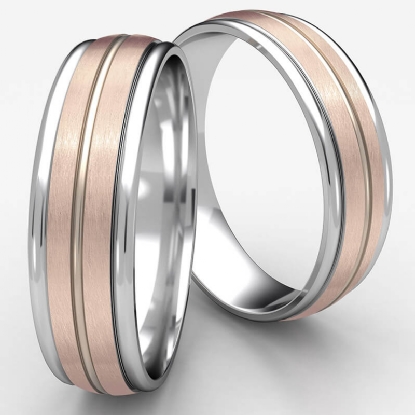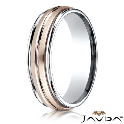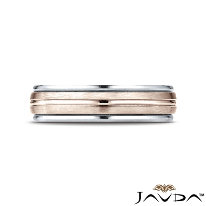 This contemporary 6mm comfort fit carved design unisex wedding band features a high polished white gold round edges with rose gold satin finished center cut for modern look. The perfect combination creates an unique style, made from 14k two tone gold. This gorgeous ring for men's and women's is long lasting and comfortable to wear everyday.
