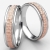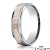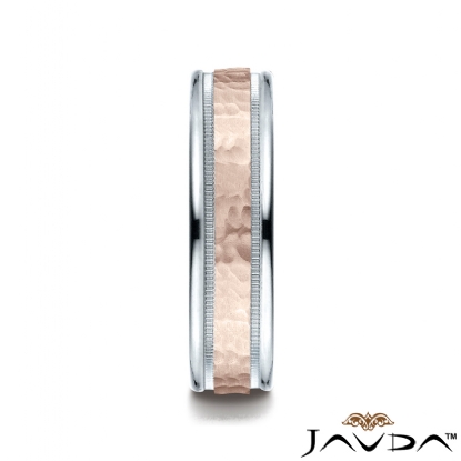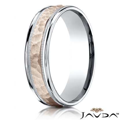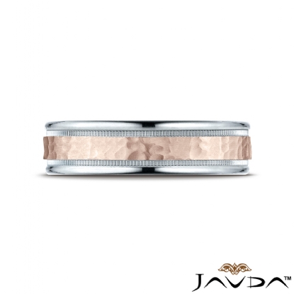 An elegant comfort fit unisex carved design wedding band features a high polished white gold round edges with milgrain and rose gold hammered finished center for a stunning look. These eye catching wedding ring for men's and women's is comfortable to wear everyday. Made from 14k two tone gold, measures 6mm wide.