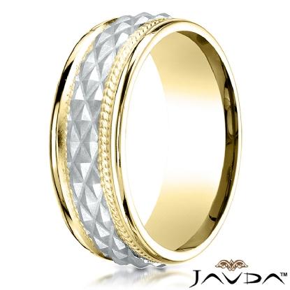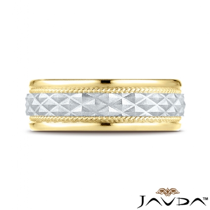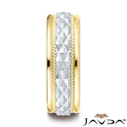 This amazing comfort fit unisex carved design wedding band features a center cross hatch design with an additional rope detailing along the sides and polished edges. Made from 14k two tone gold, measures 8mm wide. This delightful wedding ring for men's and women's is long lasting and perfect for everyday wear.