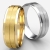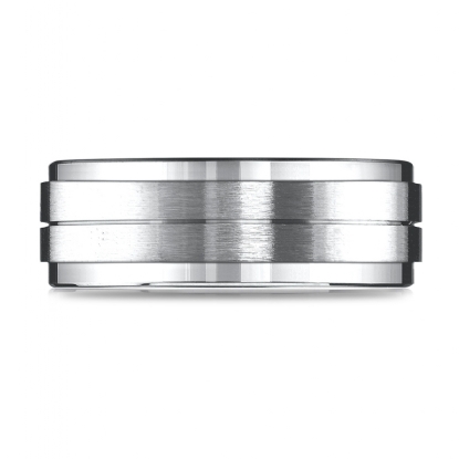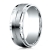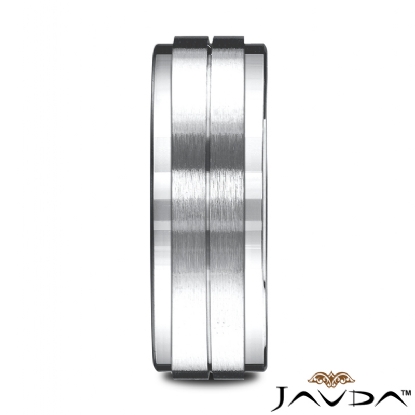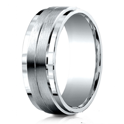 This stylish comfort fit men's carved design wedding band features a satin finished center with thin cut and polished drop beveled edge. Made from 14k white gold, measures 8mm wide. This handsome wedding ring is long lasting and perfect for everyday wear. Available in white gold, yellow gold and rose gold.