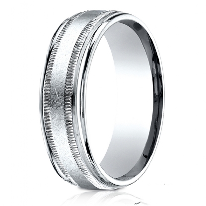 This modern comfort fit men's carved design wedding band features a polished round edge along with swirled finish center framed by milgrain detailing. The perfect handsome wedding band, made from 14k white gold, measures 7mm wide. Available in white gold, yellow gold and rose gold.