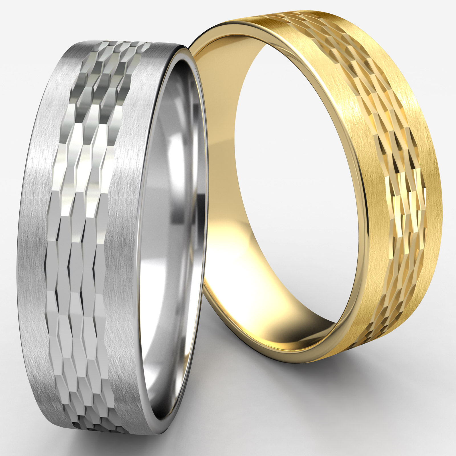 This exquisite 6.5mm width comfort fit unisex carved design wedding band features a satin finished edge along with mesh finish center. The gorgeous wedding band for men's and women's made from 14k white gold. This wedding ring is long lasting and perfect for everyday wear. Available in white gold, yellow gold and rose gold.