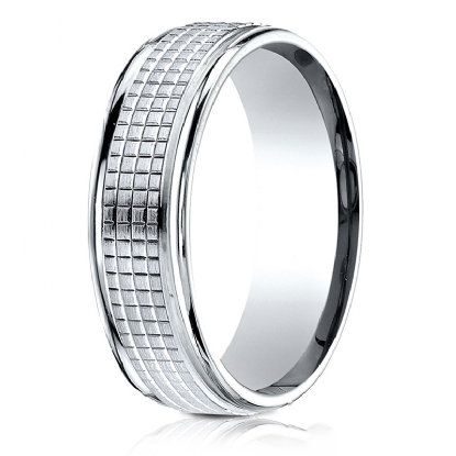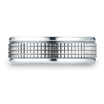 This comfort fit men's carved wedding band features a cross hatch pattern center and high polish round edges. The solid wedding band for him is made from 14k white gold, measures 7mm wide. This remarkable wedding ring is long lasting. Available in white gold, yellow gold and rose gold.